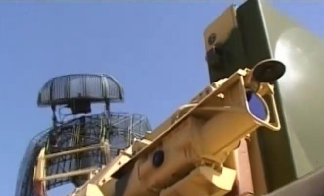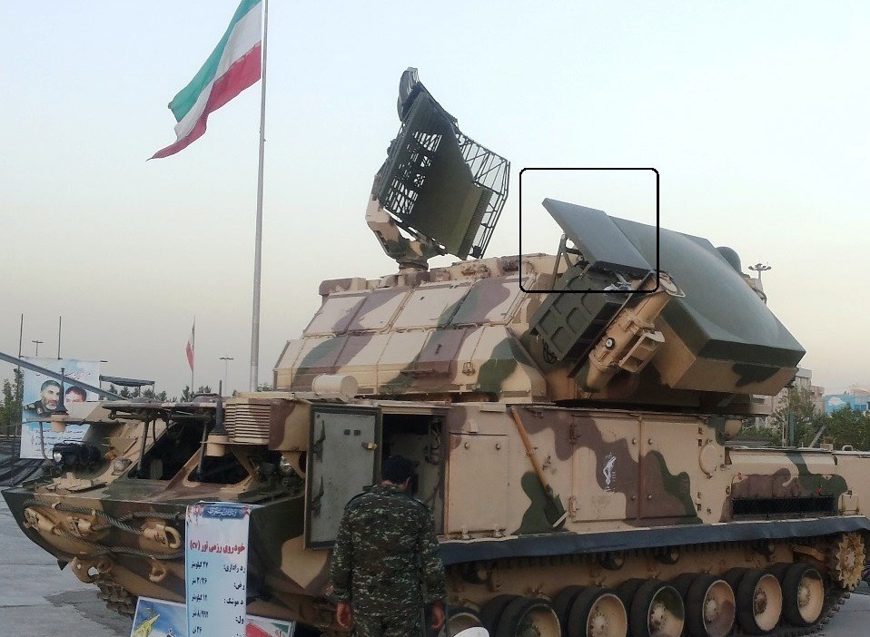 سامانه تورا-ام-1 بهسازی شده در ایران؛ آنتن مربعی کوچک در کنار آنتن ردگیری اصلی و بالای سامانه های اپتیکی قابل مشاهده است