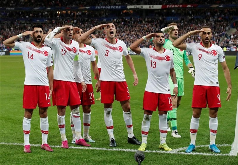 پرونده انضباطی دیگری که یوفا باز کرده، مربوط به سلام نظامی بازیکنان تیم ملی ترکیه پس از گلزنی در بازی‌های‌شان مقابل تیم‌های ملی آلبانی و فرانسه بوده که مصداق تبلیغ سیاست در فوتبال بوده است. شادی پس از گل بازیکنان تیم ملی فوتبال ترکیه پس از گلزنی در جهت حمایت آنها از حملات اخیر ارتش کشورشان به مناطق کردنشین شمال سوریه بود.
