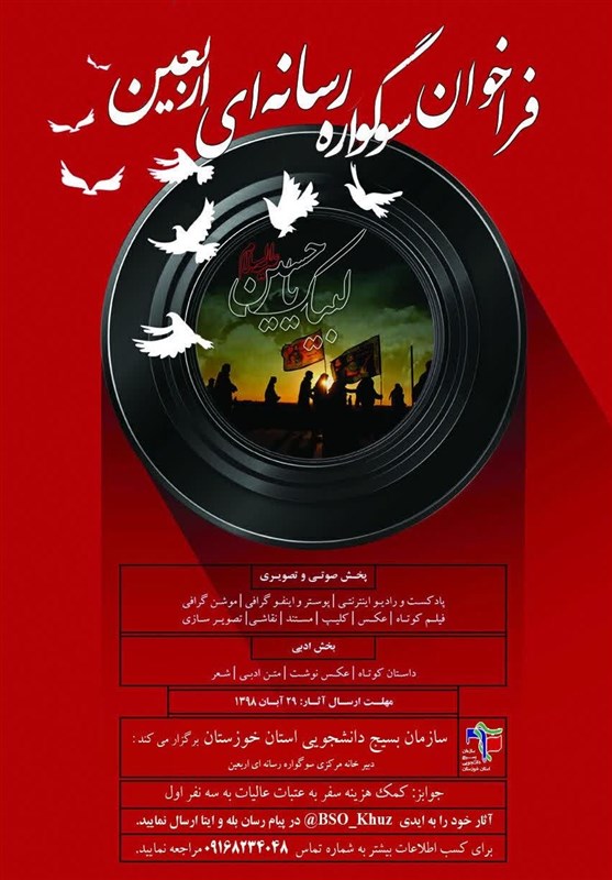 به شرکت کنندگان در فراخوان سوگواری رسانهای اربعین جوایز نفیسی همچون کمک هزینه سفر به عتبات عالیات به سه نفر اول اهدا میشود. علاقهمندان میتوانند آثار خود را به ادمین کانال bso_khuz@ در پیام رسان بله و ایتا ارسال و برای کسب اطلاعات بیشتر با شماره 09168234048 تماس برقرار کنند.