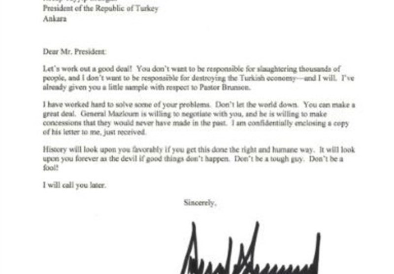 ترامپ در این نامه نوشته است: «بیایید برای دستیابی به یک توافق خوب همکاری کنیم. شما مایل نیستید مسئول کشتار هزاران نفر باشید، من هم نمیخواهم مسئول نابود کردن اقتصاد ترکیه باشم، (قطعا این کار) را خواهم کرد. شما پیشتر طعم (تحریم) ما را در ماجرای کشیش برونسون چشیدهاید.» اشاره وی به تحریمهایی است که چندی پیش در واکنش به بازداشت اندرو برانسون، کشیش آمریکایی در ترکیه آن را اعمال کرد.