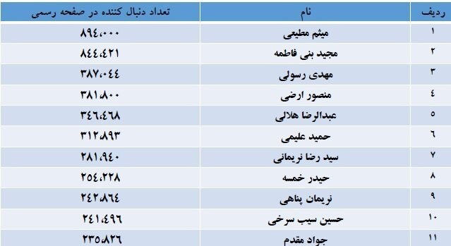 تعداد دنبالکنندگان صفحات رسمی مادحین پرطرفدار/ میثم مطیعی در صدر