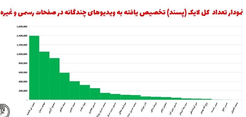 این گزارش میافزاید: نمودار تعداد کل لایک (پسند) تخصیصیافته به ویدئوهای چندگانه در صفحات رسمی و غیر رسمی مادحین به ترتیب فراوانی به این شرح است: «مجید بنی فاطمه»، «مهدی رسولی»، «محمود کریمی»، «میثم مطیعی»، «حمید علیمی»، «جواد مقدم»، «حسین طاهری»، «محمدحسین پویانفر»، «حسین سیبسرخی»، «عبدالرضا هلالی»، «محمدحسین حدادیان»، «نادر جوادی»، «نریمان پناهی»، «منصور ارضی»، «حسین عینیفرد»، «سیدرضا نریمانی»، «امیر کرمانشاهی»، «روحالله بهمنی»، «حیدر خمسه»، «حسن خلج»، «محمد فصولی».