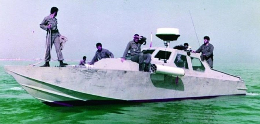 شناور سوئدی ساخت شرکت باگهامر، اولین قایق تندروی سپاه بود که در سال 1362 وارد خدمت شد/ سردار رحیم صفوی در مرکز تصویر مشاهده میشود