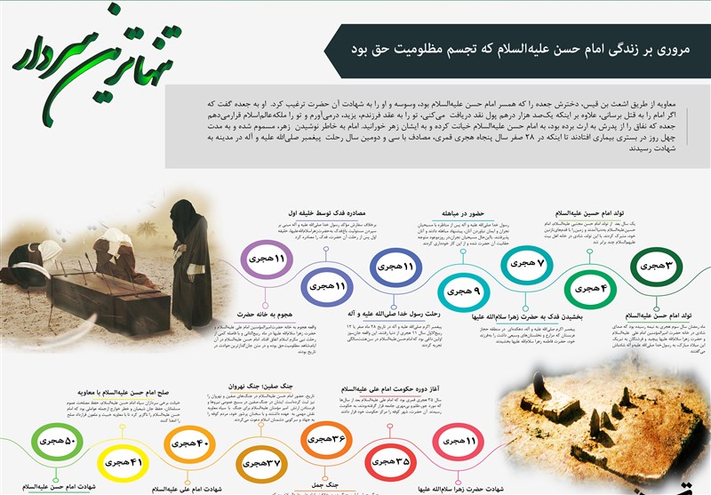 خبرگزاری تسنیم در آستانه شهادت مظلومانه امام حسن علیه السلام در قالب اینفوگرافی با عنوان به مرور زندگی آن حضرت پرداخته است.