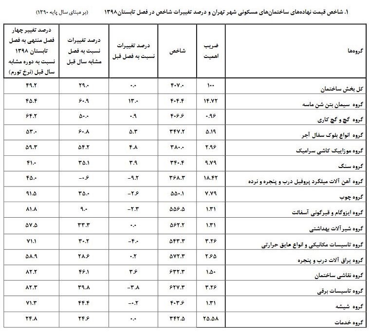 به گزارش خبرنگار اقتصادی خبرگزاری تسنیم، شاخص قیمت نهادههای ساختمانهای مسکونی شهر تهران در فصل تابستان ١٣٩٨ به عدد 407 رسید که این رقم نسبت به شاخص فصل قبل (406.9)، تقریبا بدون تغییر و نسبت به شاخص فصل مشابه سال قبل (٣١٥.٤)، ٢٩ درصد افزایش داشته است.