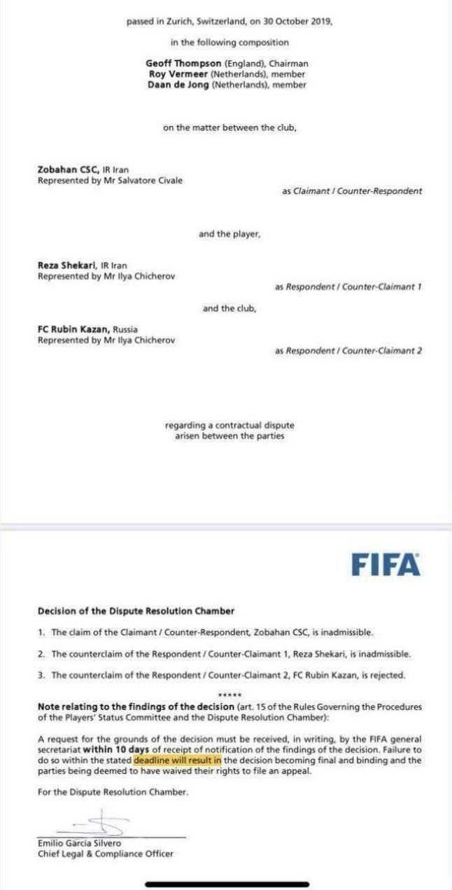 بر همین اساس، طبق رأی این ارگان فیفا شکایت باشگاه ذوبآهن از رضا شکاری و باشگاه روبینکازان رد شد.