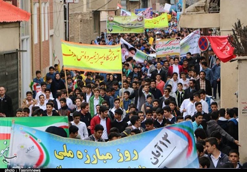 شور و شعور دانشآموزان و دانشجویان تهرانی در مراسم راهپیمایی 13 آبان امسال رنگی دیگر از روحیه استکبارستیزی ایرانیان را در چهره نسل چهارمیها به نمایش گذاشت تا به جهانیان نشان دهند ایران امروز در مسیر آرمانها و ارزشهای امام و شهدا همچنان ایستاده است و باکی از تحریمها و تهدیدات سران آمریکا ندارد.