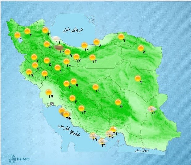 سازمان هواشناسی گرمترین منطقه ایران را جزیره ابوموسی با درجه حرارتی معادل 26 درجه سانتیگراد و سردترین را اردبیل با 2 درجه سانتیگراد اعلام کرده است. ساکنان پایتخت نیز امروز نباید منتظر پدیده خاصی بجز افزایش آلایندهها و غبار محلی باشد، برهمین اساس تهرانیها در گرمترین ساعت روز حداکثر 14 درجه و در خنکترین ساعت نیز 9 درجه سانتیگراد تجربه میکنند.