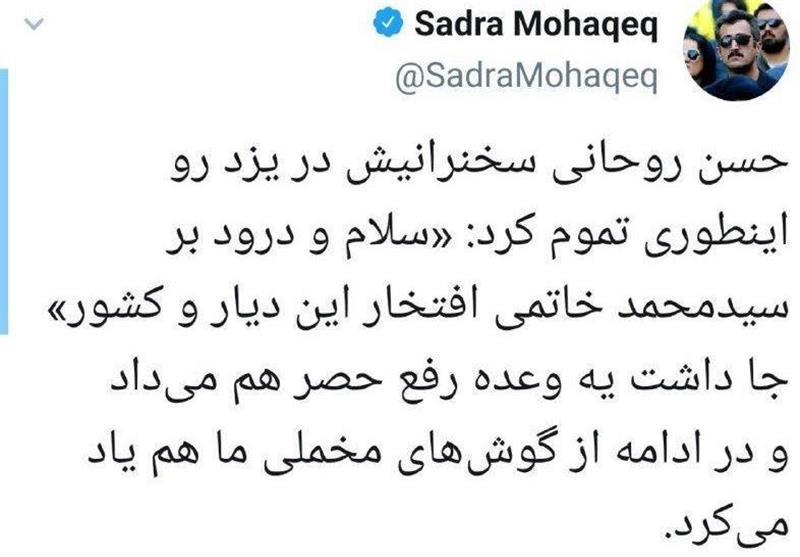 صدرا محقق دبیر اجتماعی روزنامه شرق نیز با کنایه به بخش پایانی اظهارات رئیسجمهور که همانند سفرهای گذشتهاش به یزد، سخنرانی خود را با نام بردن از رئیس دولت اصلاحات به پایان رساند، نوشت: "حسن روحانی سخنرانیاش در یزد رو اینطوری تموم کرد: «سلام و درود بر سیدمحمد خاتمی افتخار این دیار و کشور» جا داشت یه وعده رفع حصر هم میداد و در ادامه از گوشهای مخملی ما هم یاد میکرد".