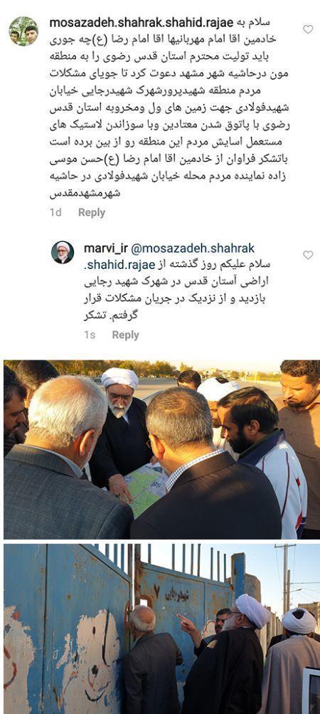 حجتالاسلام مروی در پاسخ به پیام این مخاطب نوشت: روز گذشته از اراضی آستان قدس در شهرک شهید رجایی بازدید و در جریان مشکلات قرار گرفتم.