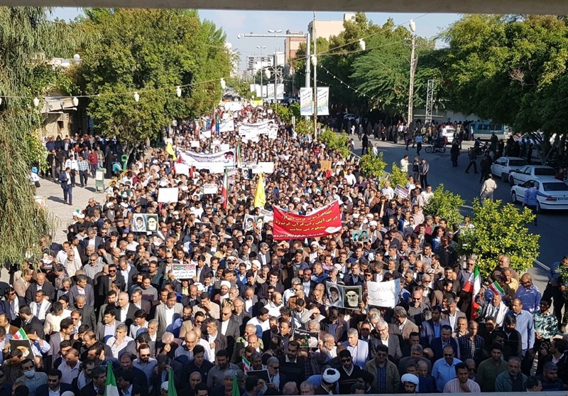 این مراسم که در مسیر خیابان فاطمیه تا میدان امام خمینی(ره) بوشهر با حضور نماینده ولی فقیه در استان بوشهر، استاندار، مسئولان، جوانان، دانشآموزان، دانشجویان، روحانیون و دیگر قشرهای مختلف مردم برگزار شد شرکت کنندگان با مشتهای گره کرده، شعارهای مرگ بر آمریکا ، مرگ بر منافق ، مرگ بر فتنهگر و آشوبگر سر دادند.