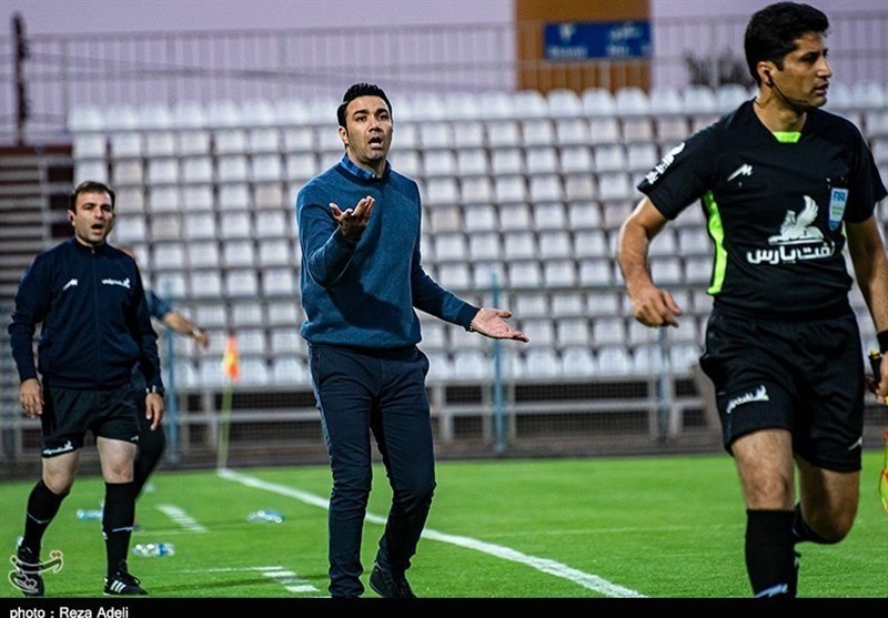 حسین کعبی، مربی تیم فولاد خوزستان در جایگاه ورزشگاه فولادشهر حضور داشت و دیدار شاگردانش را تماشا میکرد.