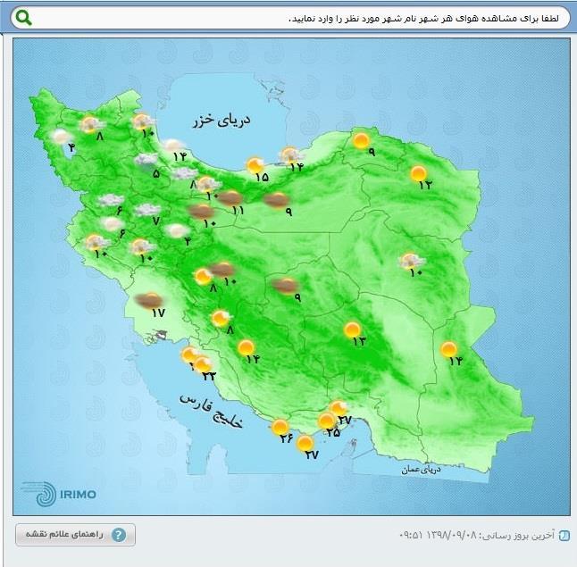 🔹 وضعیت هوای پایتخت: براساس پیشبینی کارشناسان سازمان هواشناسی استان تهران امروز شاهد آسمانی صاف تا قسمتی ابری اما غبارآلود است که این غبار در پایتخت محسوس و قابل توجه است. در شهر تهران امروز جمعه، 98/09/8 حداکثر درجه حرارت 11 درجه سانتیگراد و کمینه حرارتی شهر در خنکترین ساعت به 1 درجه سانتیگراد میرسد. کارشناسان سازمان هواشناس همچنین با توجه به سرعت وزش باد در کلانشهر تهران پیش بینی میکنند غلطت آلایندهها همچنان تا روز شنبه بالا بوده و برای گروه سنی حساس خطرناک باشد.
