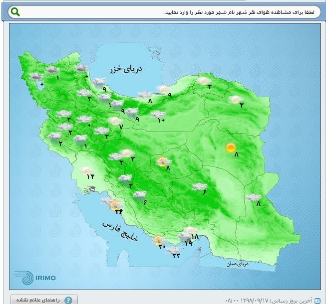 🔹گرمترین و سرد ترین نقطه ایران: با توجه به نقشه‌های هواشناسی امروز 98/9/17 گرمترین نقطه ایران شهرستان بوشهر با 23 درجه سانتی‌گراد بالای صفر و  شهرکرد با صفر درجه سانتی‌گراد سردترین نقطه کشور است.