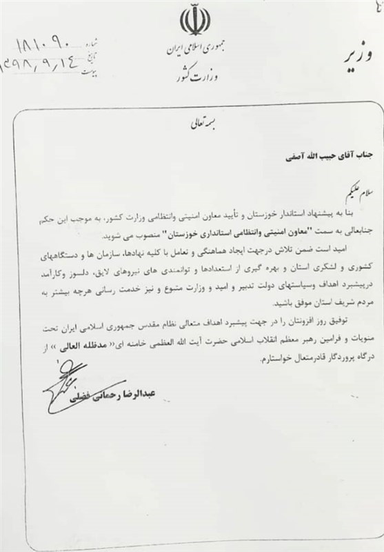 به گزارش خبرگزاری تسنیم از اهواز، حبیبالله آصفی با پیشنهاد استاندار خوزستان در حکمی از سوی وزیر کشور به سمت معاون امنیتی و انتظامی استانداری خوزستان منصوب شد.