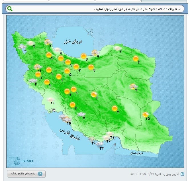 مرکزی، مازندران، کمی ابری و غبار محلی که رفته رفته به حجم ابرها افزوده میشود اردبیل، اصفهان، سمنان، قم، البرز، کرمان، کرمانشاه، آذربایجان شرقی، چهارمحال و بختیاری، سیستان و بلوچستان، زنجان، تهران، لرستان، خراسان شمالی، خراسان رضوی، همدان، یزد، کهگیلویه و بویراحمد مه رقیق و غبار محلی همراه با وزش باد آذربایجان غربی، گلستان، خوزستان، کردستان، ایلام، هرمزگان، بوشهر، گیلان، خراسان جنوبی نیمه ابری همراه با بارشهای پراکنده که در ارتفاعات به صورت برف است.