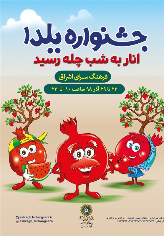 به گزارش باشگاه خبرنگاران پویا به نقل از روابط عمومی مراکز فرهنگی هنری منطقه 4، رضا دوستعلی مدیر فرهنگی هنری منطقه 4 و رئیس فرهنگسرای اشراق در این باره اظهار داشت: جشنواره یلدا، به دنبال برگزاری موفق نهمین جشنواره انار(صد دانه یاقوت)، از 22 تا 29 آذرماه در دو بخش نمایشگاهی و برنامه ای اجرا میشود.