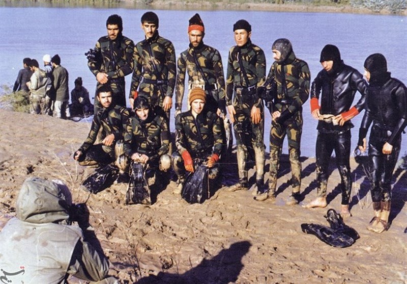 جمعی از غواصان گردان ولیعصر(عج) در منطقه رودخانه کارون، روستای قجریه، موقعیت شهید اجاقلو