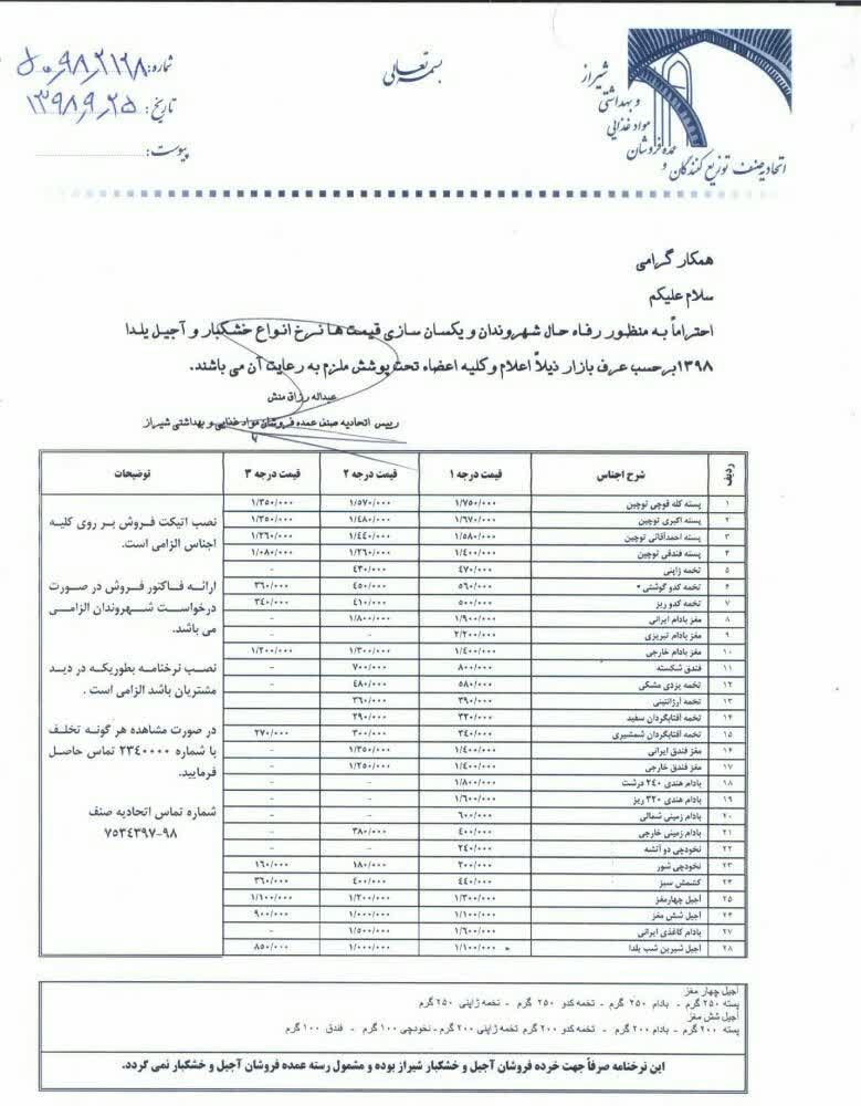 امسال نیز در آستانه شب یلدا قرار داریم و طبق روال هر سال نرخنامهای از سوی اتحادیه خشکبار اعلام شده تا مردم از قیمتها مطلع باشند و در صورت تخلف کاسبان را اطلاع دهند.