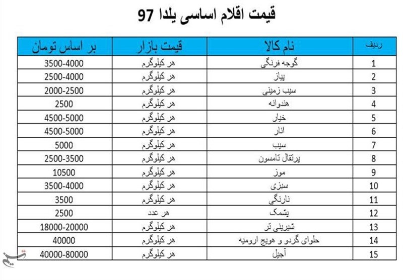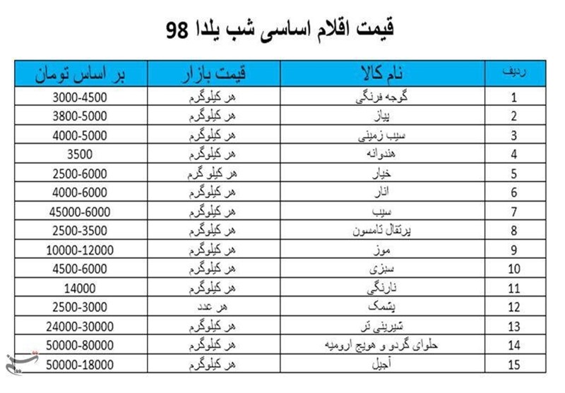 به گزارش خبرگزاری تسنیم از ارومیه ،این خبرگزاری در نظر دارد با انتشار انواع کالاها و اجناس مایحتاج مردم در سطح بازار در آستانه شب یلدا و همچنین مقایسه قیمتهای مشابه در سال گذشته برای مسئولان شفافسازی کرده تا با اقدام به موقع جلو سوءاستفاده برخی گرانفروشان را بگیرند.
