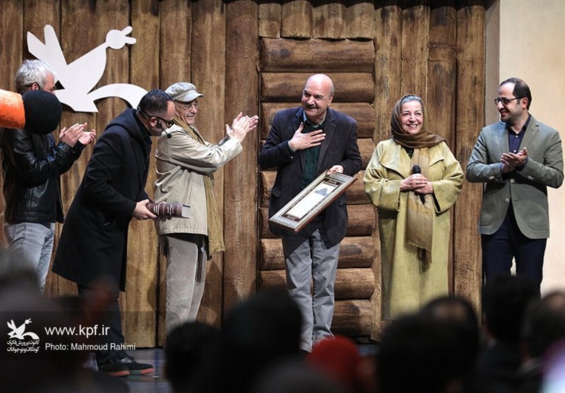 همچنین رضا بابک، احسان کرمی، کاظم سیاحی و عروسکهای نمایش جشنواره روی صحنه لوح تقدیر او را اهدا کردند.