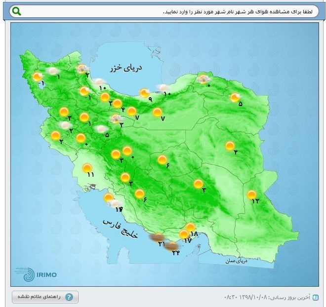 🔹 وضعیت جوی استان‌ها: اطلاعات ماهواره‌ای از شرایط جوی کشور نشان می‌دهد امروز 98/10/08 اگرچه اغلب نقاط ایران آسمانی صاف راتجربه می‌کنند. اما برخی نقاط شمالغرب و سواحل خزر امروز و فردا بارندگی‌های پراکنده داشته و در ارتفاعات بارش برف دور از انتظار نیست؛ به این ترتیب شرایط جوی استان‌ها در 24 ساعت آینده این گونه است.