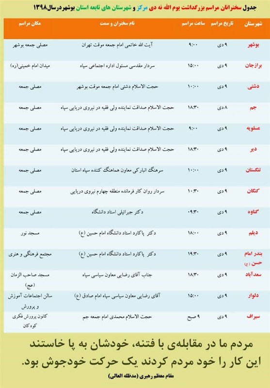 وی گفت: این مراسم در شهرهای مختلف، مراکز شهرستانها و روستاهای استان بوشهر با حضور پرشور مردم برگزار میشود.