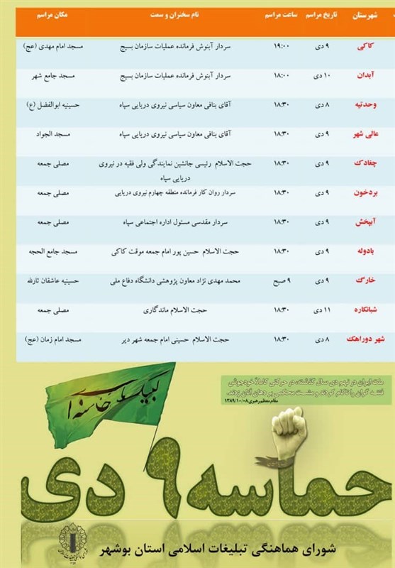 رئیس شورای هماهنگی تبلیغات اسلامی استان بوشهر از برگزاری مراسم حماسه 9 دی در سراسر استان بوشهر خبر داد و خاطرنشان کرد: مراسم حماسه 9 دی در سراسر استان بوشهر برگزار میشود که سخنران این مراسم در مرکز استان حجتالاسلام والمسلمین سید احمد خاتمی امام جمعه موقت تهران است.