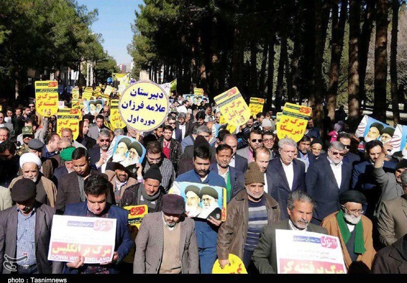 در انتهای مراسم مردم به همراه مسئولان و نماینده ولی فقیه در خراسان جنوبی و نماینده ولی فقیه در سپاه قدس مسیر خیابان شهید تیمورپور را راهپیمایی کردند و شعارهایی از قبیل مرگ بر امریکا، مرگ بر اسرائیل، مرگ بر فتنه گر، مرگ بر آشوبگر را سر دادند.