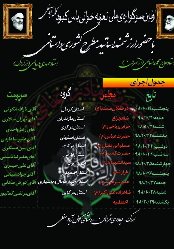 به گزارش خبرگزاری تسنیم از کرمان، محمدرضا علیزاده صبح امروز در جمع خبرنگاران اظهار داشت: مرحله نهایی سوگواره کشوری تعزیه استان مرکزی با عنوان "یاس کبود" همزمان با ایام شهادت حضرت زهرا (س) در دهه اول فاطمیه برگزار می شود.