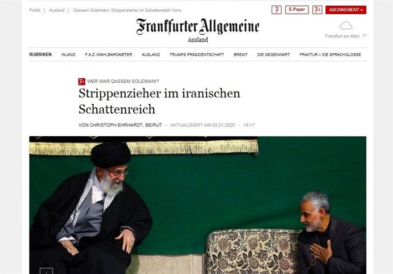 روزنامه "فرانکفورتر آلگماینه سایتونگ" آلمان هم در مطلبی نوشت که حاج قاسم سلیمانی خیلی بیشتر از یک فرمانده نظامی در ایران بود. وی یکی از معتمدین صمیمی رهبر انقلاب بود.