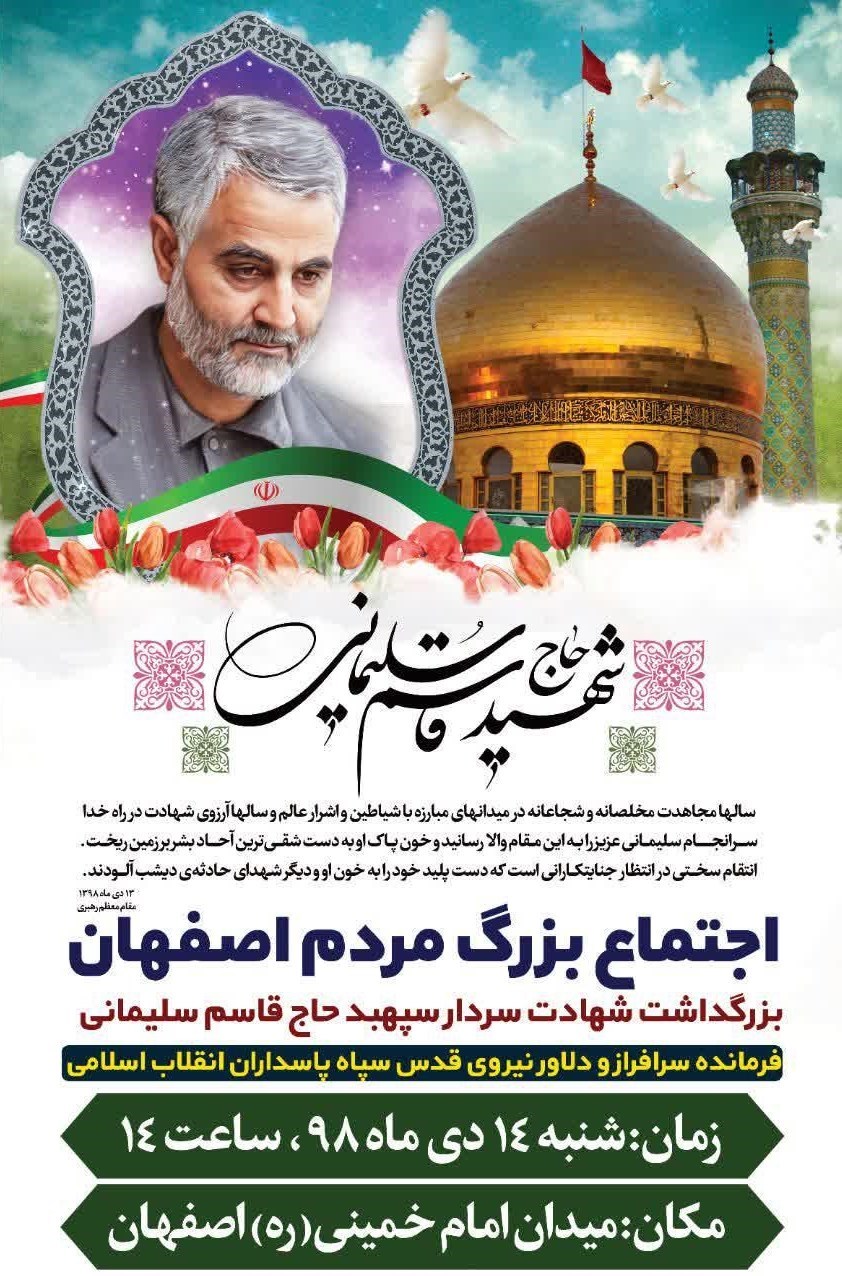به گزارش خبرگزاری تسنیم از اصفهان، در پی شهادت سرافرازانه سردار سپهبد حاج قاسم سلیمانی فرمانده دلاور نیروی قدس سپاه پاسداران انقلاب اسلامی مراسم و آیینهای گرامیداشتی در سراسر استان اصفهان در حال برگزاری است.