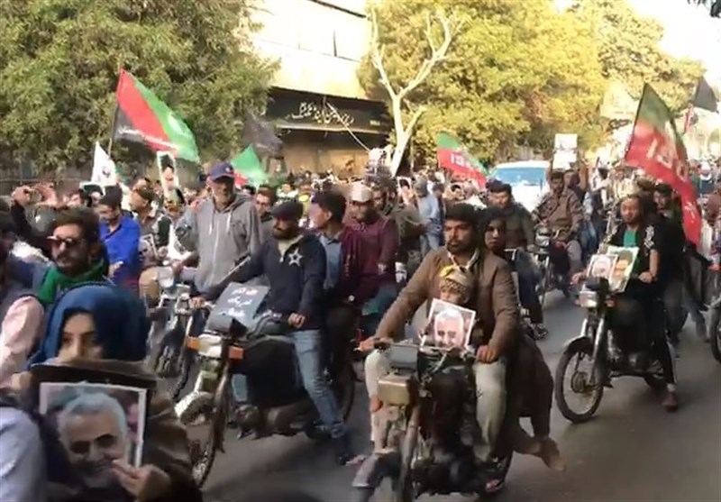 مسلمانان پاکستانی با راه انداختن دسته های بزرگ موتور سوار تصاویر امام راحل، مقام معظم رهبری، شهید سلیمانی و سید حسن نصرالله را به دست گرفتند.
