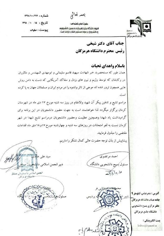 در این نامه که به امضای تشکل های مختلف دانشجویی دانشگاه هرمزگان از جمله بسیج دانشجویی، انجمن اسلامی دانشجویان مستقل، هیئت دانشجویی، شورای صنفی خوابگاه و شورای صنفی دانشکده مدیریت رسیده است، دانشجویان از دکتر شیخی ریاست دانشگاه هرمزگان درخواست کرده اند به منظور شرکت دانشجویان در مراسم بزرگداشت شهدا امتحانات روزهای سه شنبه و چهارشنبه این دانشگاه لغو و به زمان دیگری موکول شود.