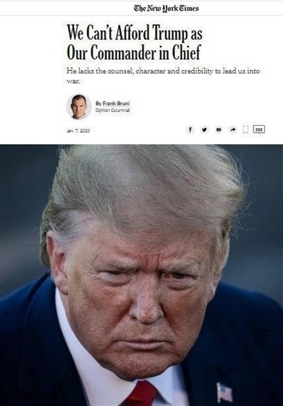 به گزارش گروه بین الملل خبرگزاری تسنیم، روزنامه آمریکایی نیویورک تایمز در مطلبی با اشاره به بی کفایتی ترامپ و روش غیردپلماتیک وی برای تعامل با کشورها از جمله ایران نوشته است: ما نمیتوانیم به ترامپ به عنوان فرمانده کل قوای خود اعتماد کنیم.