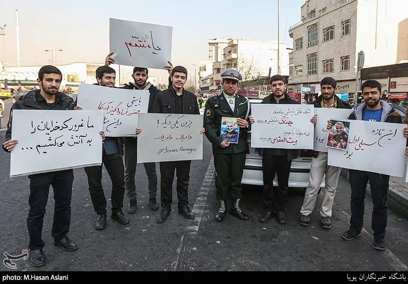 مجتبی هم که 14 ساله است گفت: من از نسل حسین فهمیده 14 ساله‌ای هستم که نارنجک بست و زیر تانک رفت. او سرش و تنش رفت اما دست از کشورش برنداشت. من هم راه او و راه حاج قاسم را ادامه می‌دهم و از همینجا می‌گویم ترامپ اگر حاج قاسم ما را شهید کردی ما همه حاج قاسم هستیم و از سپاه برای این اقدام قدردانی می‌کنیم اما به تو اعلام می‌کنیم حواست باشد دست از پا خطا کنی حیفا  و تل آویو را با خاک یکسان می‌کنیم.