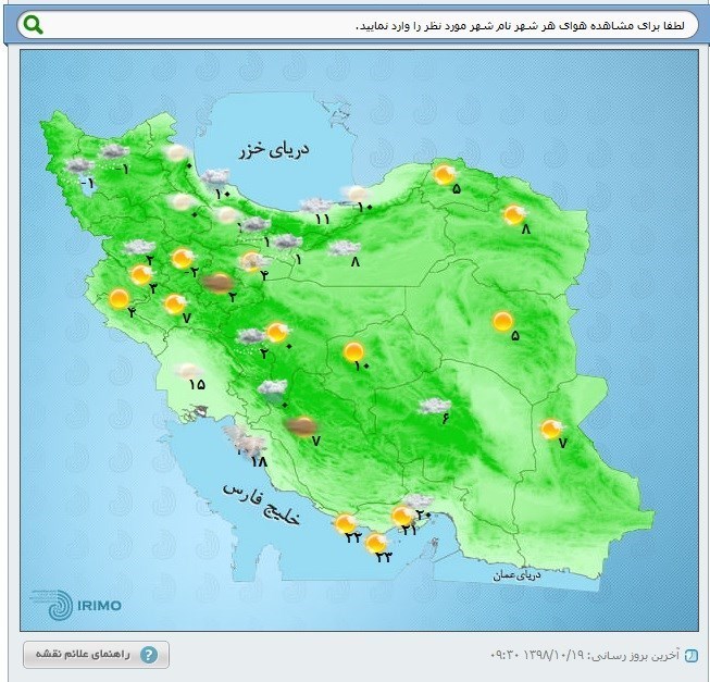 🔹گرمترین و سردترین نقطه ایران: اطلاعات ارسالشده از ایستگاههای هواشناسی در شهرهای مختلف به سازمان هواشناسی نشان میدهد امروز 19 دیماه 98 جزیره ابوموسی با 23 درجه سانتیگراد بالای صفر گرمترین نقطه و شهرستان همدان با 3 درجه سانتیگراد زیر صفر سردترین نقطه کشور است.