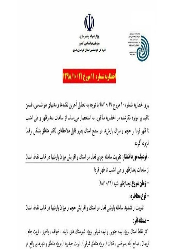 در این اطلاعیه عنوان شده است که در نتیجه افزایش حجم بارش‌ها در غالب نقاط استان امکان یخبندان و لغزندگی معابر وجود دارد و باید نکات ایمنی به ویژه در ترددها لحاظ شود.