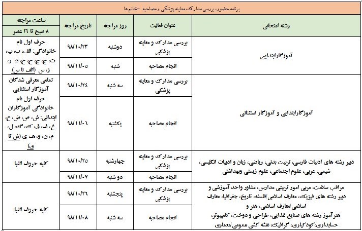 بر اساس این اطلاعیه، با توجه به اعلام اولیه نتایج هفتمین آزمون استخدامی متمرکز دستگاههای اجرایی کشور در سال 1398 که در مورخ 98/10/13 از طریق سایت سازمان سنجش آموزش کشور اعلام شده بود، بدین وسیله برنامه زمان بندی مراجعه معرفی شدگان برای ارزیابی مدارک و مستندات و طی مراحل بعدی، به شرح زیر اعلام و توجه معرفی شدگان به این مرحله را به موارد ذیل معطوف میدارد.