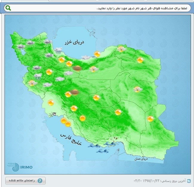 🔹گرمترین و سردترین نقطه ایران: اطلاعات ارسالشده از ایستگاههای هواشناسی در شهرهای مختلف به سازمان هواشناسی نشان میدهد امروز 23 دیماه 98 جزیره ابوموسی با 19 درجه سانتیگراد بالای صفر گرمترین نقطه و شهرستان شهرکرد با 9 درجه سانتیگراد زیر صفر سردترین نقطه کشور است.
