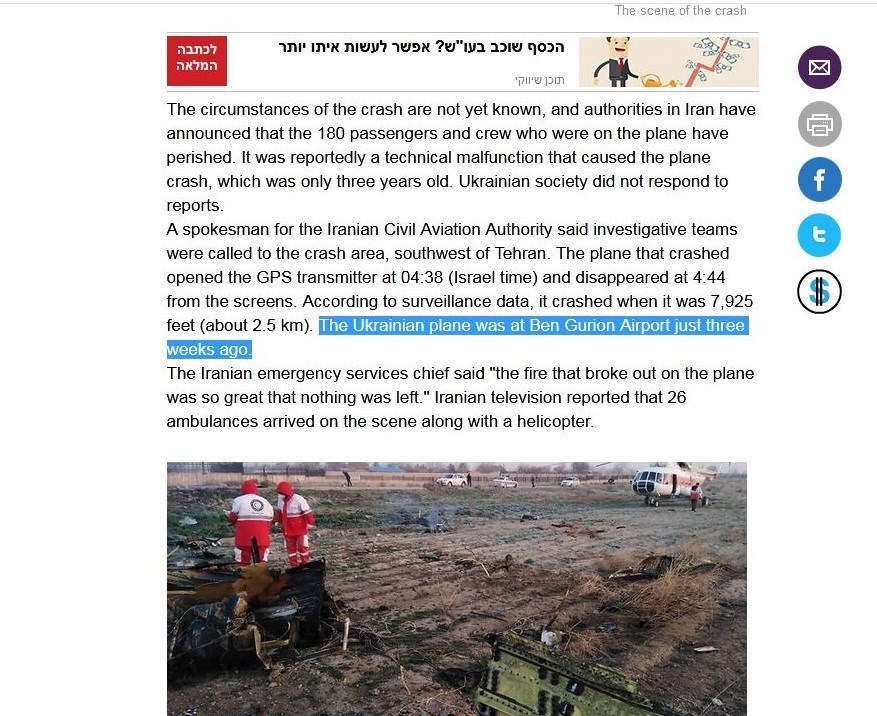 اطلاعرسانی یک سایت عبری درباره هواپیمای اوکراینی؛ این بخش از اطلاعات این سایتها در بخشهای انگلیسی به طور کامل حذف شده است