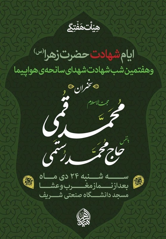 به گزارش خبرنگار فرهنگی خبرگزاری تسنیم، هیئتالزهرای دانشگاه شریف امشب (سهشنبه، 24 دی) مراسمی را با نیت شهادت حضرت زهرا(س) و هفتمین شب شهادت شهدای سانحهی هواپیما امشب 24 دی برگزار میکند.
