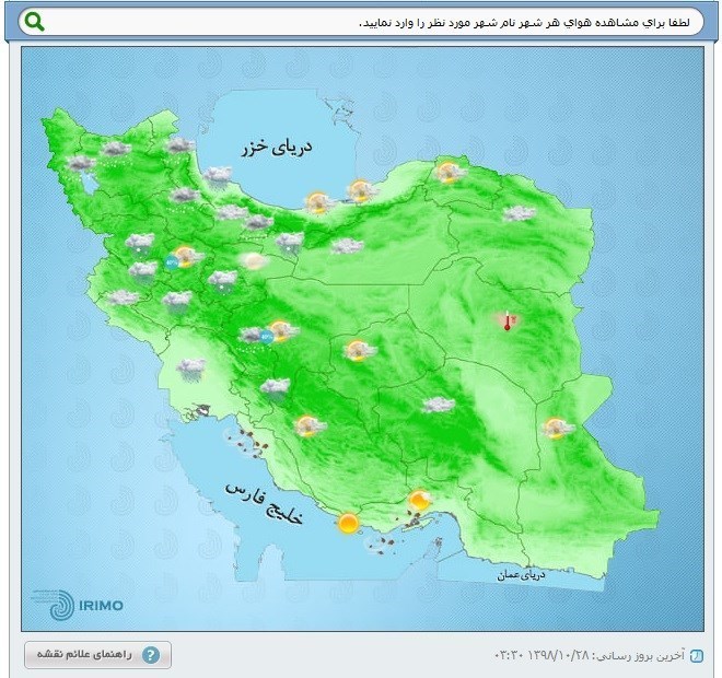 🔹گرمترین و سردترین نقطه ایران: اطلاعات ارسالشده از ایستگاههای هواشناسی در شهرهای مختلف به سازمان هواشناسی نشان میدهد امروز 28 دیماه 98 جزیره ابوموسی با 18 درجه سانتیگراد بالای صفر گرمترین نقطه و شهرستان ارومیه با 4 درجه سانتیگراد زیر صفر سردترین نقطه کشور است.