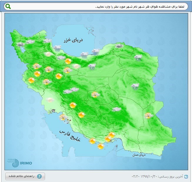 🔹گرمترین و سردترین نقطه ایران: اطلاعات ارسالشده از ایستگاههای هواشناسی در شهرهای مختلف به سازمان هواشناسی نشان میدهد امروز 30 دیماه 98 جزیره ابوموسی با 22 درجه سانتیگراد بالای صفر گرمترین نقطه و شهرستان ارومیه با 3 درجه سانتیگراد زیر صفر سردترین نقطه کشور است.