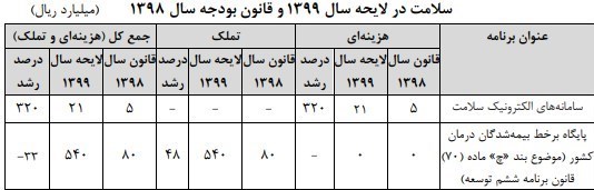 از نکات دیگری که در این گزارش میتوان به آن اشاره داشت موضوع پرونده الکترونیک سلامت است، تنها 2 میلیارد تومان برای اجرای این پرونده طی بودجه سال 99 در نظر گرفته شده است و این درحالی است که اعتبار مورد نیاز برآوردشده حدود 400 میلیارد تومان است. اعتبارات درنظر گرفتهشده برای استقرار پایگاه اطلاعات برخط بیمهشدگان نیز ذیل ردیفهای متفرقه قرار دارد و از این جهت عملکرد آن را با تردید مواجه کرده است، همچنین در این راستا 54 میلیارد تومان نیز برای استقرار پایگاه برخط بیمهشدگان درمان کشور طبق قانون برنامه ششم توسعه در اختیار سازمان بیمه سلامت قرار خواهد گرفت.
