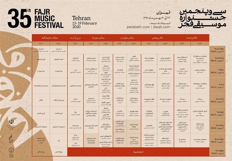 به گزارش خبرگزاری تسنیم، جدول برنامه های سی و پنجمین جشنواره موسیقی فجر منتشر شد و فروش بلیت اجراها غیر از بخش پاپ در تالار وحدت، تالار رودکی، فرهنگسرای نیاوران، برج آزادی و تالار سوره از ساعت 18 امروز دوشنبه 7 بهمن در سایت تیوال (www.tiwall.com) آغاز می شود. فروش بلیت بخش پاپ نیز با اعلام اجراهای پاپ جشنواره از دوم بهمن ماه در سایت پارس بلیت www.parsbelit.com)) آغاز شده است.