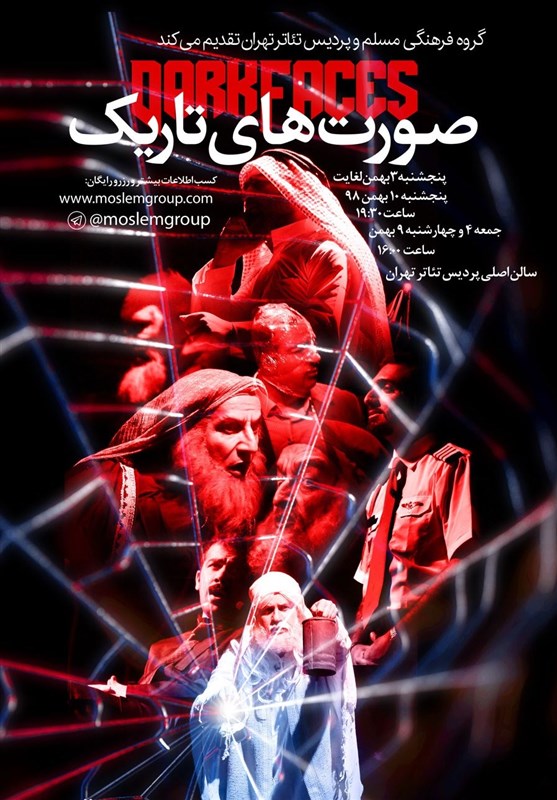 نمایش «صورتهای تاریک» کاری از گروه هنری مسلم روزهای چهارشنبه و پنج شنبه 9 و 10 دی در سالن اصلی پردیس تئاتر تهران روی صحنه میرود. این نمایش در روز چهارشنبه ساعت 16 و روز پنجشنبه ساعت 19:30 اجرا خواهد داشت.