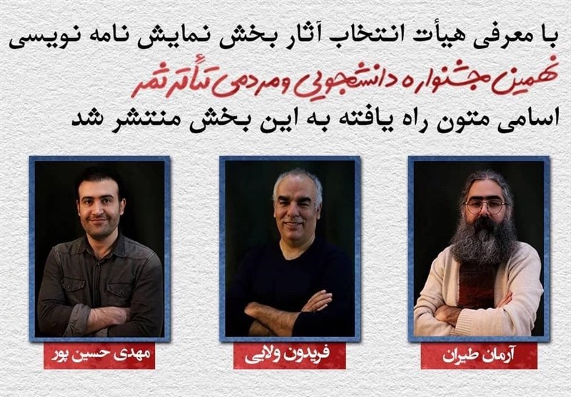 آرمان طیران ، فریدون ولایی و مهدی حسین پور طی یک ماه گذشته از بین 71 اثری که شرایط لازم برای داوری را دارا بودند، آثار را مورد بررسی و خوانش قرار داده و در نتیجه با جمع بندی آرا تعداد 10 اثر ذیل را بدون اولویت برای مرحله بعدی بخش نمایشنامهنویسی این جشنواره انتخاب کردند: