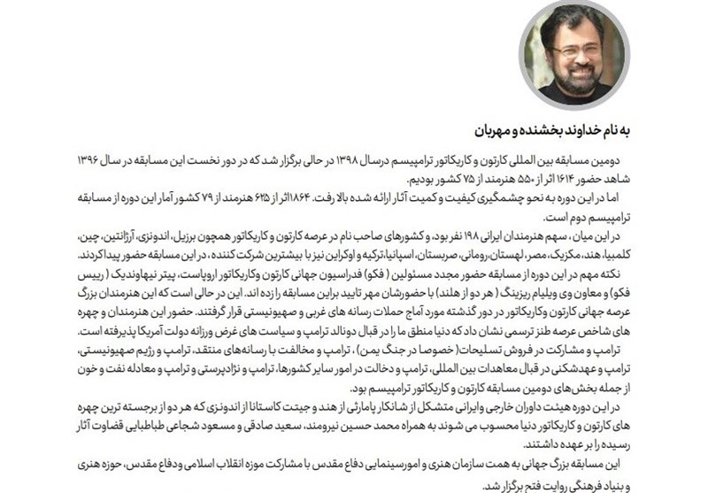 به گزارش خبرگزاری تسنیم از اردبیل، اثر رسول حاجیزاده هنرمند جوان اردبیلی در مسابقه بینالمللی که با موضوع دونالد ترامپ برگزار شده بود از بین یک هزار و 865 اثر از 625 کارتونیست 79 کشور برای چاپ در کاتالوگ ویژه انتخاب و جزو فینالیستها و برترین کارتونیستهای جهان شد.