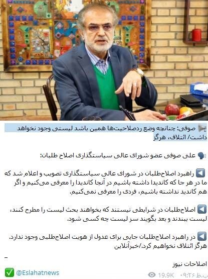 3- از آنجایی که تعدادی لیست با اشتراک افراد نزدیک 20 نفر منتشر شده است لذا چند احتمال برای آنان مطرح است. اگر افراد مشترک در لیست ها رای نیاورند که باز با این ادعا که ما قادر به دادن لیست واحد نبودیم لذا اصلا در انتخابات شرکت نکرده ایم شکست خود را توجیه خواهند نمود. کاری که در این جریان سابقه ای طولانی دارد.